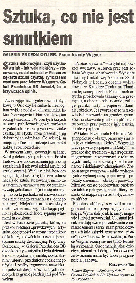 Jest w Krakowie galeria, która, na przekor niechęci "prawdziwych" artystów i obojętności ze strony urzędników od kultury, od dwóch lat prezentuje wyłącznie sztukę dekoracyjną. Przy ulicy Skałecznej w Galerii Przedmiotu BB dwie kobiety - artystka i była dziennikarka - wystawiają meble, szkło, tkaniny, ubiory, przedmioty codziennego użytku i rzeźby sygnowane nazwiskami polskich designerów, znanych i cenionych za granicą bardziej niż pod Wawelem (...)