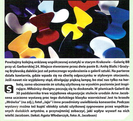 Jest w Krakowie galeria, która, na przekor niechęci "prawdziwych" artystów i obojętności ze strony urzędników od kultury, od dwóch lat prezentuje wyłącznie sztukę dekoracyjną. Przy ulicy Skałecznej w Galerii Przedmiotu BB dwie kobiety - artystka i była dziennikarka - wystawiają meble, szkło, tkaniny, ubiory, przedmioty codziennego użytku i rzeźby sygnowane nazwiskami polskich designerów, znanych i cenionych za granicą bardziej niż pod Wawelem (...)